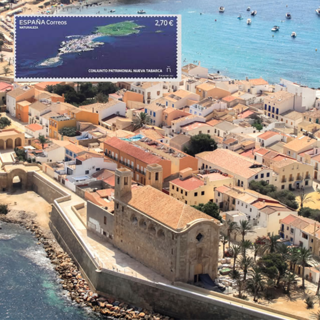 El sello que Correos dedica a este importante enclave insular recoge una bella imagen aérea de todo su conjunto patrimonial, tanto del núcleo histórico habitado y fortificado, su entorno marino, así como como del Campo, que muestra la bella floración del otoño tabarquino.