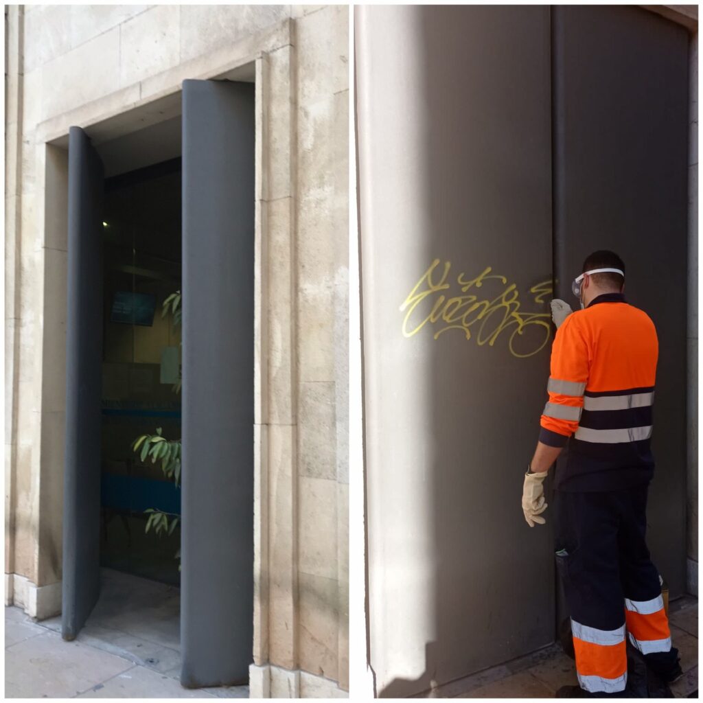 También se habían realizado pintadas sobre las puertas metálicas del edificio del Palacio consistorial y en una de las paredes de piedra del pórtico del Ayuntamiento de Alicante, sujeto a una especial protección por su carácter de Bien de Interés Cultural.