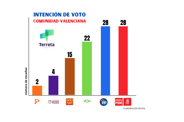 Una encuesta interna a la que ha tenido acceso en exclusiva Terreta Radio otorga la mayoría absoluta al Partido Popular y Vox, gracias a la caída en picado de Unidas-Podem.